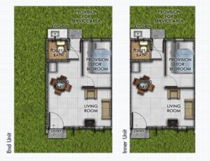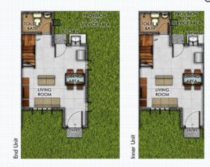 Lumina Homes' Angeli Duplex Model is a 42 square meter home on a regular 54 square meter lot. Its features include a living area, dining & kitchen, 3-bedroom provision, 1 toilet & bath, 1 carport provision, and service area.