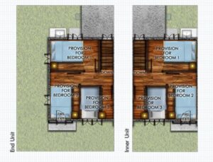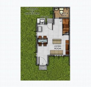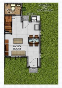Lumina Homes' Angeli Townhouse Model is a 42 square meter home on a regular 36 square meter lot. Its features include a living area, dining & kitchen, 3-bedroom provision, 1 toilet & bath, 1 carport provision, and service area.